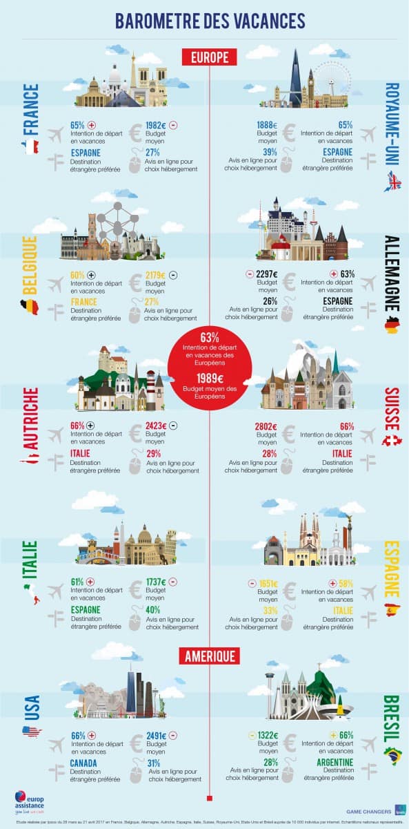 Les touristes européens seront plus nombreux à partir cet été. Les Belges enregistrent une progression de 13 points tandis que le pourcentage de touristes Italiens, Espagnols et Allemands projetant de partir augmente de 9 points. La France suit la tendance avec une augmentation de 8 points. 65% de Français, soit 42 millions de touristes partiront en vacances en 2017. C’est 2,2 millions de plus qu’en 2016.